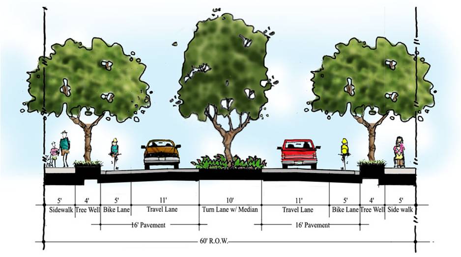 Our Main Street is a 67′ right of way. We have a Main Street that is already plenty wide to have many options. We have yet to plan what we want the public space of our Main Street to look like. I will keep you updated on how to get involved early in this planning process! We would love to hear your voice on what you would like your Main Street to look like.)